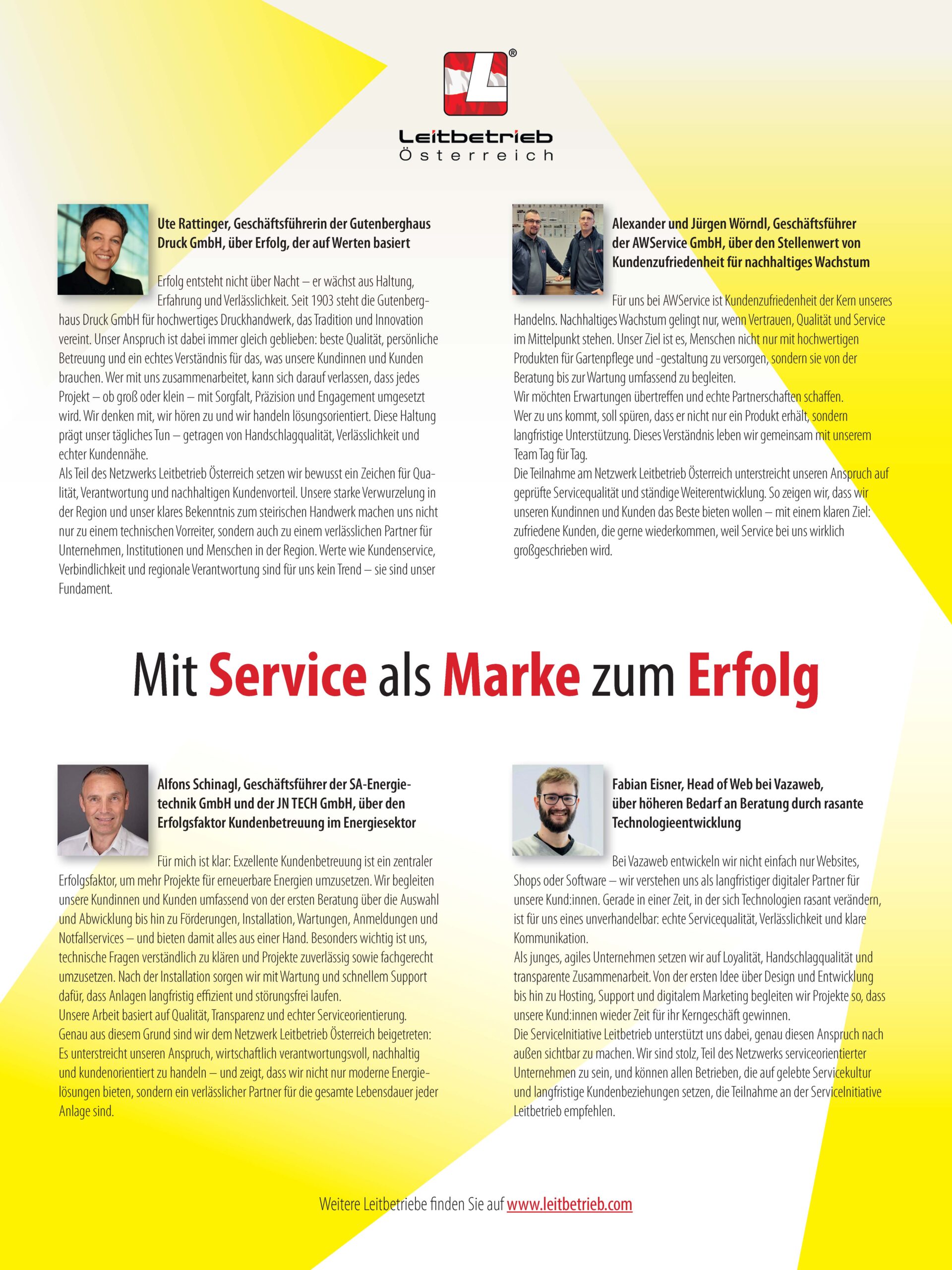 Die Teilnahme am Netzwerk Leitbetrieb Österreich unterstreicht unseren Anspruch auf geprüfte Servicequalität und ständige Weiterentwicklung. So zeigen wir, dass wir unseren Kundinnen und Kunden das Beste bieten wollen – mit einem klaren Ziel: zufriedene Kunden, die gerne wiederkommen, weil Service bei uns wirklich großgeschrieben wird.“